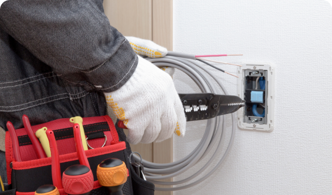 新築物件にて有線機器を使用する場合は、工事の段階によって配線を目立たなくすることが可能です。無線機器を使用し、配線の露出を極力少なくした施工も行っております。