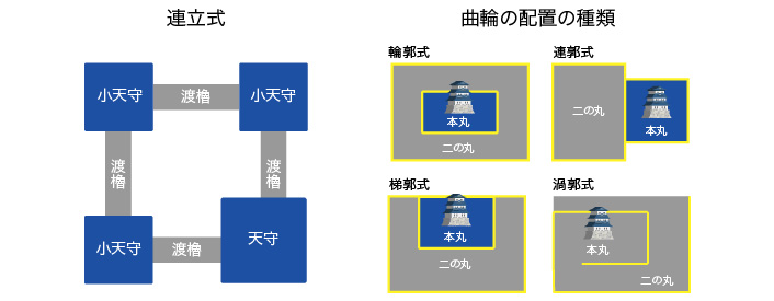 連立式の天守は、防備が極めて厳重で天守への入口が渡櫓で連結された建物に囲まれています。そのため内側に中庭のような空間ができる特徴があり、この空間に敵兵を誘い入れることで四方から攻撃することができるようになっています。