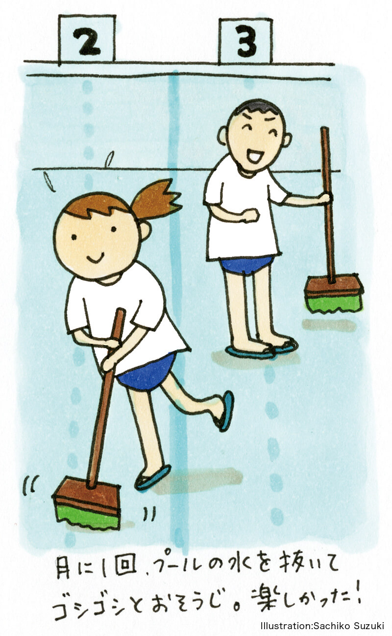 爽やかで健康的なバイト仲間たち。目上の人から名前を呼ばれるときは名字呼び捨ての体育会系。美大とは対照的な世界で、それがまた楽しかった。水着に白いTシャツ、首にはホイッスルを下げ、足下はビーチサンダルが定番のスタイル。仕事は、さまざまなポジションを5~6人のローテーションでこなしていく。タワー(はしごと椅子が合体したもの)からの監視、プールサイドを巡回するパトロール、受付、監視員室で待機(休憩)などがあり、私のお気に入りは、ガラス張りの司令室。休憩時間の放送や自分の好きな音楽を流せるので、ちょっとしたDJ気分が味わえた。