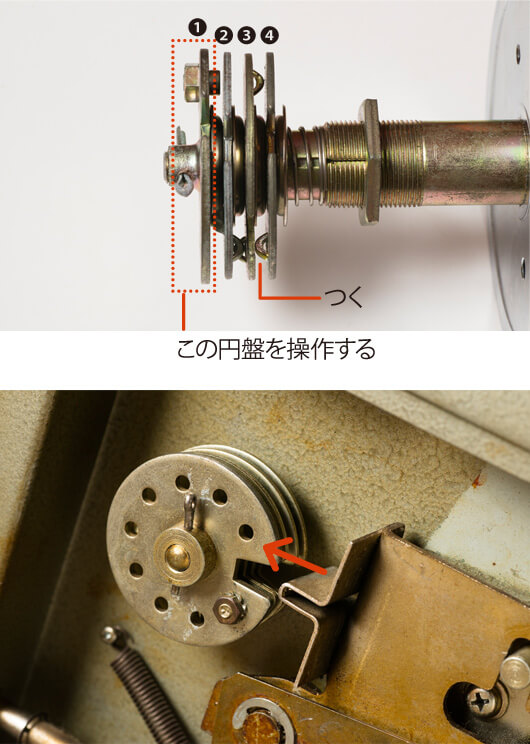 4枚の円盤にキリカキと「つく」と呼ばれる突起が1つずつ。ダイヤルを1回転すると、(1)の円盤が連動して回る。2回転目で(1)のつくが(2)のつくと当たって(2)の円盤が回り出す。同じように3回転目で(3)の円盤が、4回転目で(4)の円盤が動き出す。