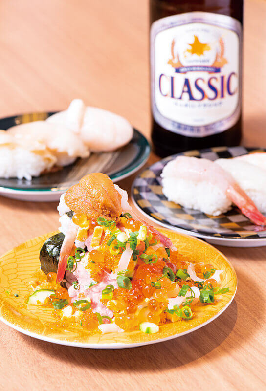 「函太郎 小樽店」も小樽運河沿いの倉庫を改装した店舗で、北海道産の魚介類を提供する寿司店として地元民にも愛されています。回転寿司といって侮れないのが小樽。旬の魚介や、地元でしか味わえないネタは多彩。今の時季はウニなど目移りします。
