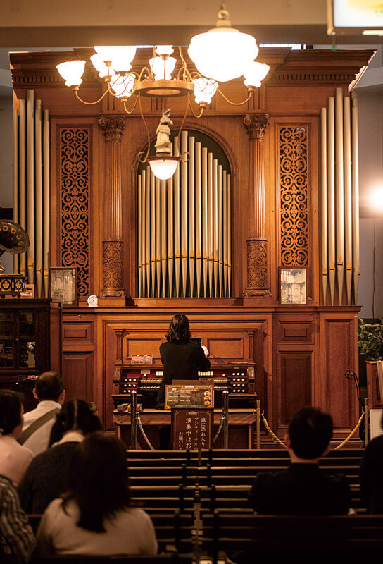 2号館のパイプオルガンは690本のパイプを備え、ロールペーパーでの自動演奏も可能。
