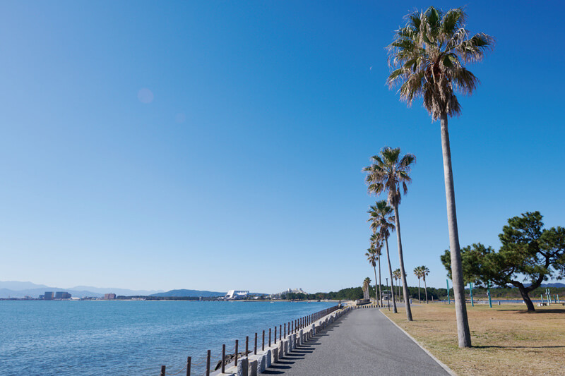 写真左上の「光と風の広場」にある博多湾沿いの道は潮風が気持ちよく、散歩にピッタリ。