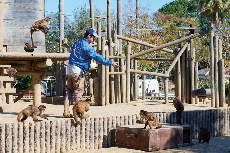 右下はフサオマキザルのエサやりの様子。