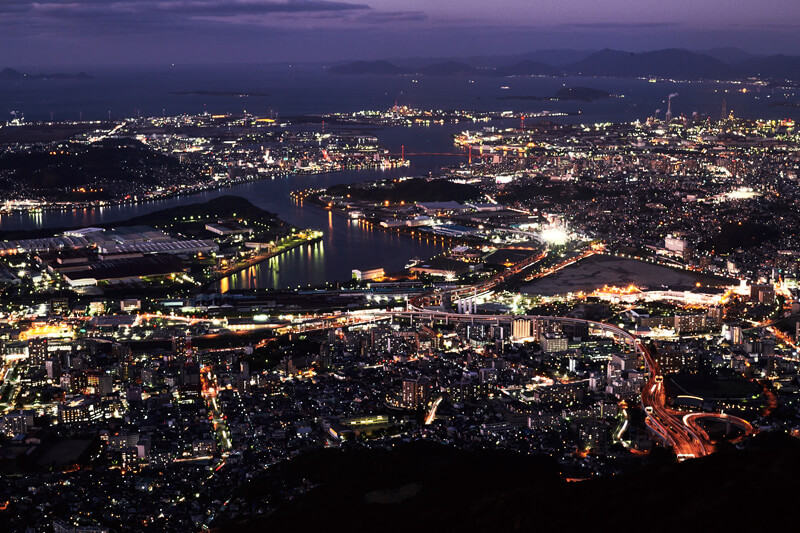 八幡東区にある「皿倉山」の展望台に登ると、そんな北九州市街地を見渡せます。ケーブルカーとスロープカーを乗り継ぎ、10分ほどで標高622mの山頂に到着。青く広がる玄界灘、赤く映える若戸大橋、工場群からもくもくと上がる煙も一望できます。空がオレンジ色に染まって日が沈み、次第に美しい夜景に。「新日本三大夜景」のひとつに選定された〝100億ドルの夜景〟です。街と工場が放つ幻想的なきらめきは、寒さにこごえたぶん、さらに美しく輝いて見えるでしょう。