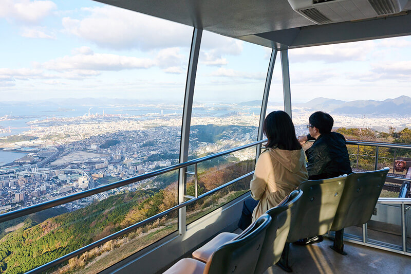 北九州を代表する山。写真右はスロープカー。ガラス張りの車窓からパノラマの絶景を楽しめる。
