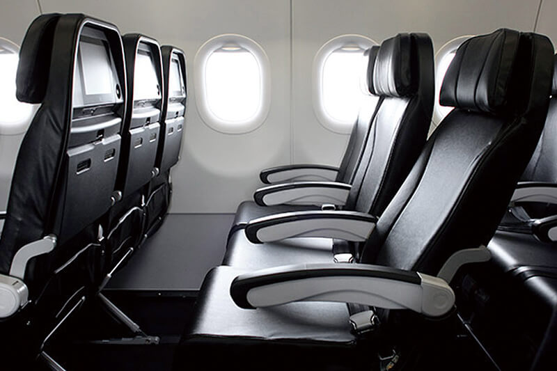 国内7都市6路線と台北への2路線を運航。機体とシートの色が黒で統一されている。全席レザーシートで、他社のシートが最大180席のところ、すべて150席に設定されており、シートピッチが広くゆったり座れる。