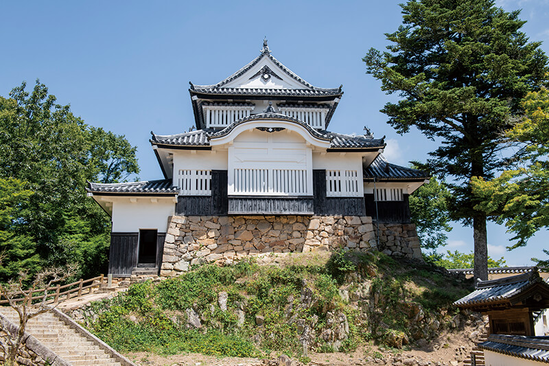 「備中松山城」へは登城口である、ふいご峠から向かいます。杖をつきながら山道を登ること約15分、高くそびえる石垣群「大手門跡」が目の前に立ちはだかります。天然の岩盤の上に石垣が築かれており、苔が生えて木漏れ日がふりそそぐ姿は疲れを吹き飛ばす美しさです。そこからさらに5分ほど登っていくと、石垣と土塀にぐるりと囲まれた天守が見える二の丸へとたどり着きます。天守は二層二階ですが、三層に見えるようにデザインされています。高さは約11mと、現存する天守のなかでは最も低いですが、重厚感や力強さを感じます。一階には籠城に備えて囲炉裏や装束の間が設けられています。二階の窓からは山並みや麓に広がる城下町を眺められ、山城の標高の高さを実感します。
