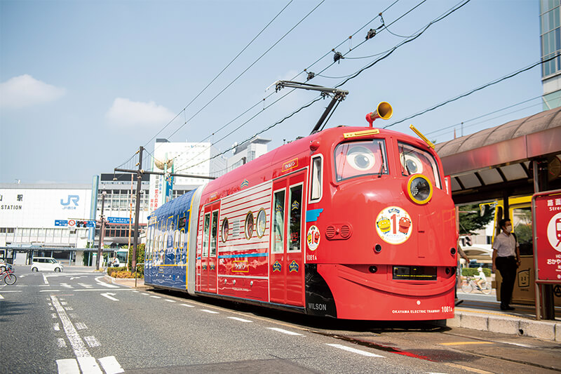 岡山市内を歩いていると、レトロな路面電車「岡電」(岡山電気軌道)に出会います。そのなかでも目を引くのが「おかでんチャギントン電車」。イギリスのアニメ「チャギントン」を実車化した路面電車です。車内は水戸岡鋭治氏がデザインしました。壁も椅子もカラフルで、いたるところに「チャギントン」のキャラクターが描かれており、大人でも思わず心が躍ります。「チャギントン」に乗れるのは世界中でここだけなので、貴重な体験ができます。「おかでんチャギントン電車」の最終駅、東山電停には「おかでんチャギントンミュージアム」があります。岡電の工場の一角を水戸岡氏がリノベーションした施設です。木のぬくもりあふれる空間で、「チャギントン」のアニメを見たり、プラレールを操縦したりと、子供たちが自由に遊べます。隣には岡電の車庫があるので、整備士が路面電車を整備したり、塗装している様子を間近に見られます。