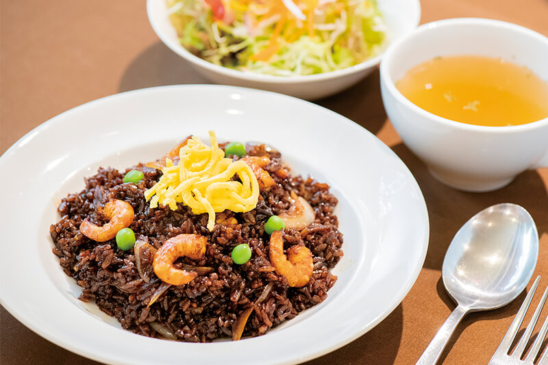 「えびめし(サラダ・スープ付)」(792円、税込)。 真っ黒な見た目に驚く。