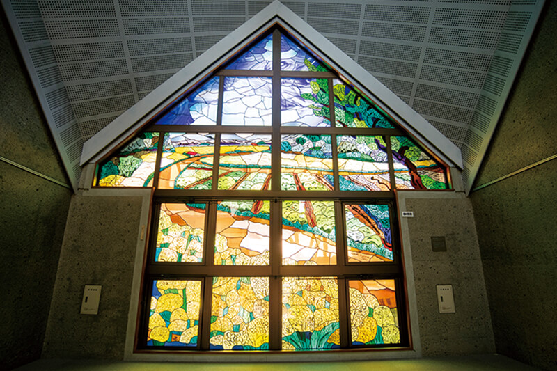 踊り場のステンドグラスは「朧月夜」の歌詞にある「菜の花畠」をイメージして作られた。