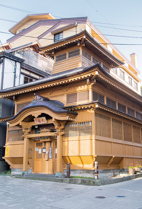温泉街の中心に建つ「野沢温泉 外湯 大湯」。野沢温泉には13の外湯が点在しており、外湯巡りを楽しめる。