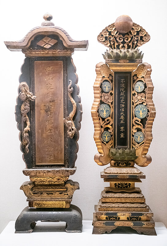 左が武田信玄、右が上杉謙信の位牌。2人の位牌が並んでいるのは全国でここだけ。