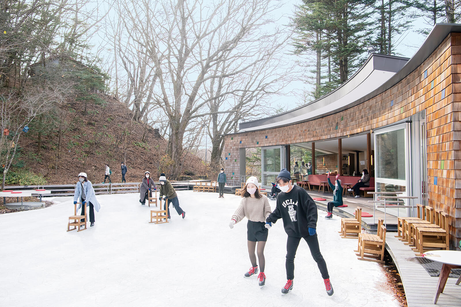 続いて長野駅から中軽井沢駅へ。10分ほど車を走らせて、観光スポットが集まる「軽井沢星野エリア」に向かいます。まずは森の中を歩いて「ケラ池スケートリンク」へ。森に囲まれたリンクは円形ではないので、一定方向にぐるぐる回らず自由に滑れます。屋外で自然を感じながら、真っ白な氷上を滑っていると、野鳥の鳴き声も聞こえてきました。