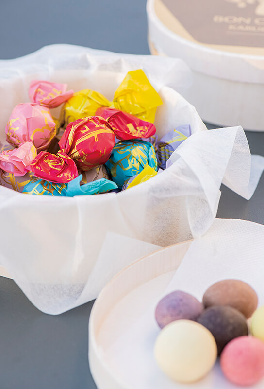 「チョコレートボール」はマカダミアナッツに濃厚チョコレートをコーティング。なめらかなチョコとカリッとしたナッツがおいしい。味はりんご、ブルーベリー、レモン、いちご、ビター、キャラメルの6種類。
