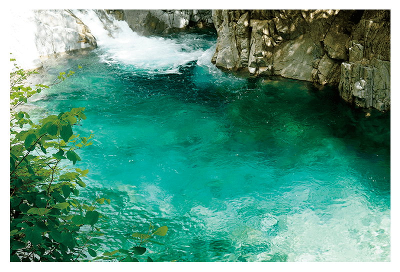 長野県の一級河川、木曽川の支流の一つである阿寺(あでら)川沿いにある渓谷で、木曽谷の南部に位置します。清流は全長約15㎞あり、木曽五木(きそごぼく)(ヒノキ、サワラ、アスヒ、コウヤマキ、ネズコ)に囲まれています。下流の阿寺渓谷入口から上流の阿寺渓谷キャンプ場まで約6.3㎞にわたって舗装された道が続いており、滝や切り立った岩などが作り出す自然の造形美を眺めながらハイキングができます。いちばんの見どころは美しい水。エメラルドグリーンに輝き、「阿寺ブルー」といわれています。川の深さによって色の濃度が異なるので、歩くたびにその違いを楽しめます。