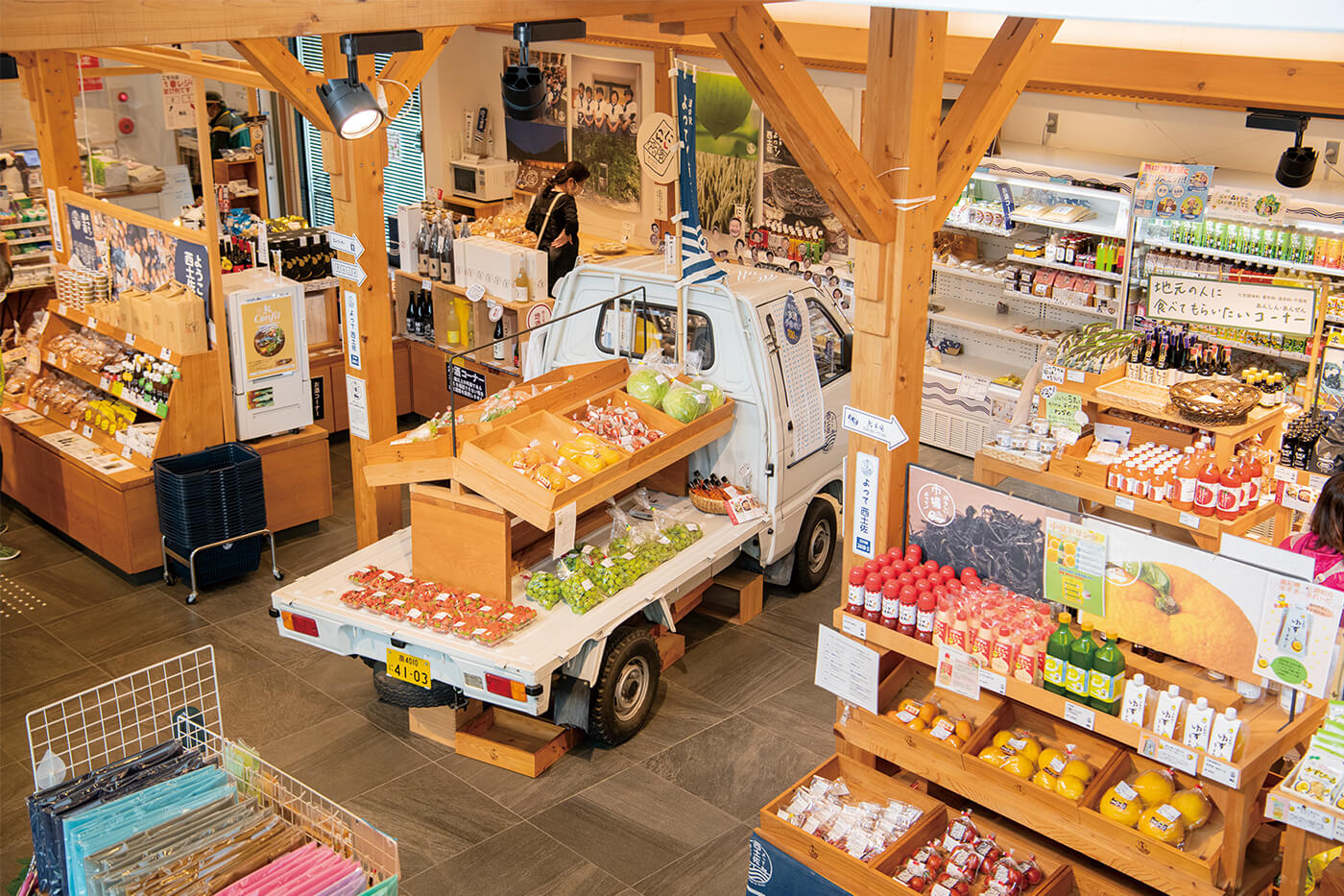 「水々しい市場」では、地域住民にとっての象徴である軽トラに旬の食材が並ぶ。地元食材を使った昼食を提供する「西土佐食堂」も併設。
