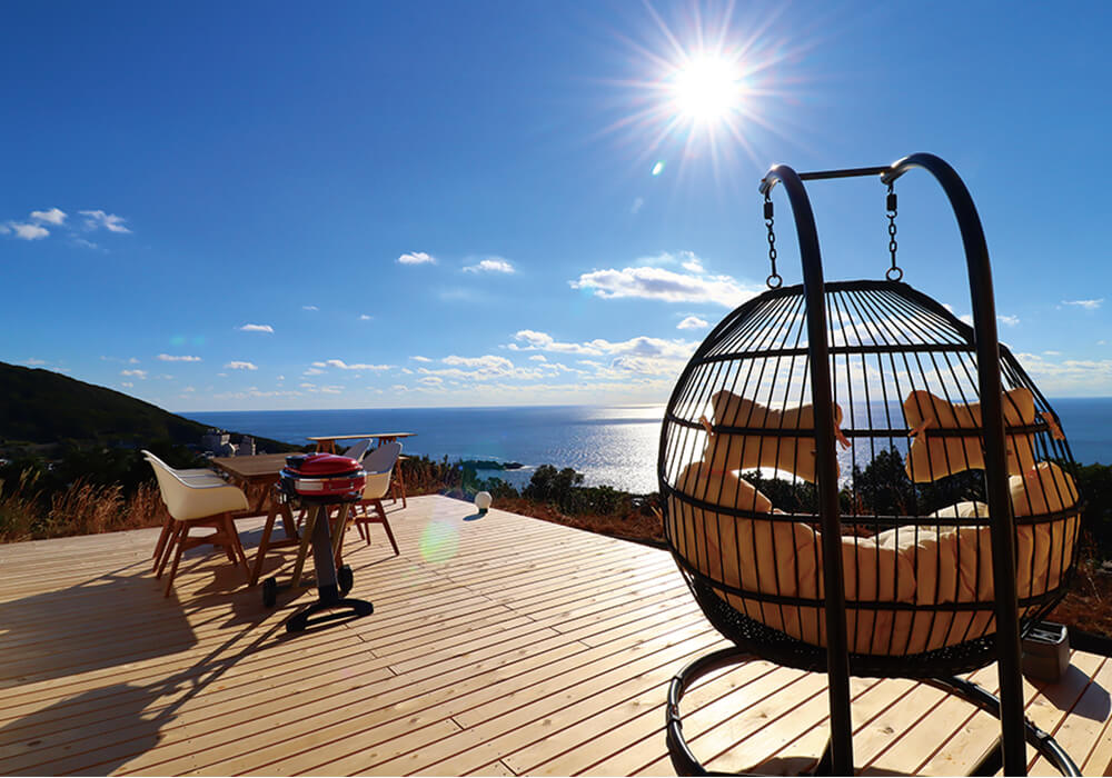 四国最南端の足摺岬(あしずりみさき)には、その絶景を望む山の上にホテル「アシズリテルメ」があります。ラグジュアリーな空間と雄大な景観で、「リトリート(心身をリセットさせる)」や「特別な体験」ができます。人気なのが併設のグランピング施設「Dot Glampingアシズリテルメ」。ベッドに寝転ぶと足摺の絶景を独り占めできます。