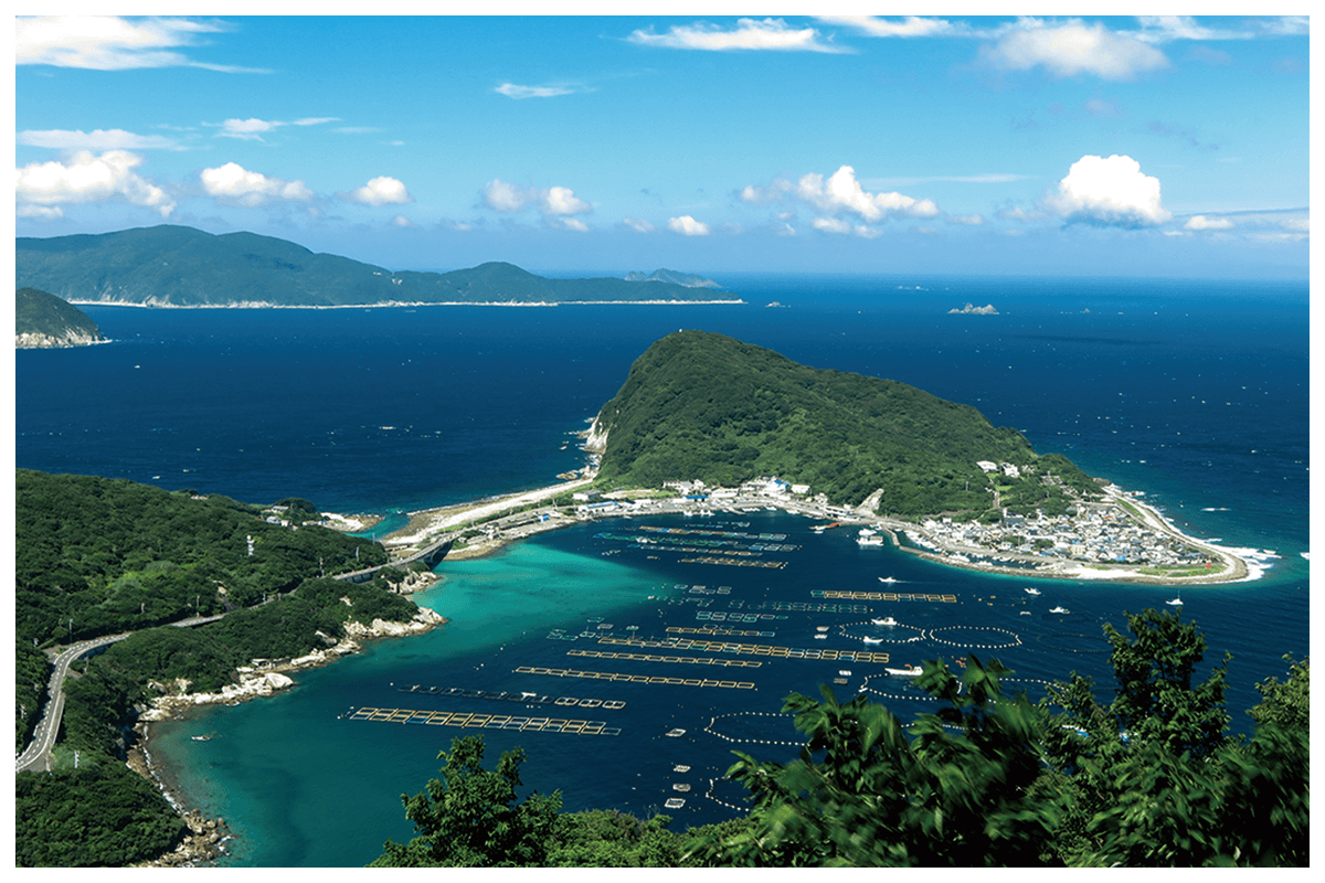 「大堂山展望台」からの景色。大月町は高知県で唯一、マグロの養殖を行なっており、海上には生け簀が浮かぶ。左奥に見えるのは沖の島。