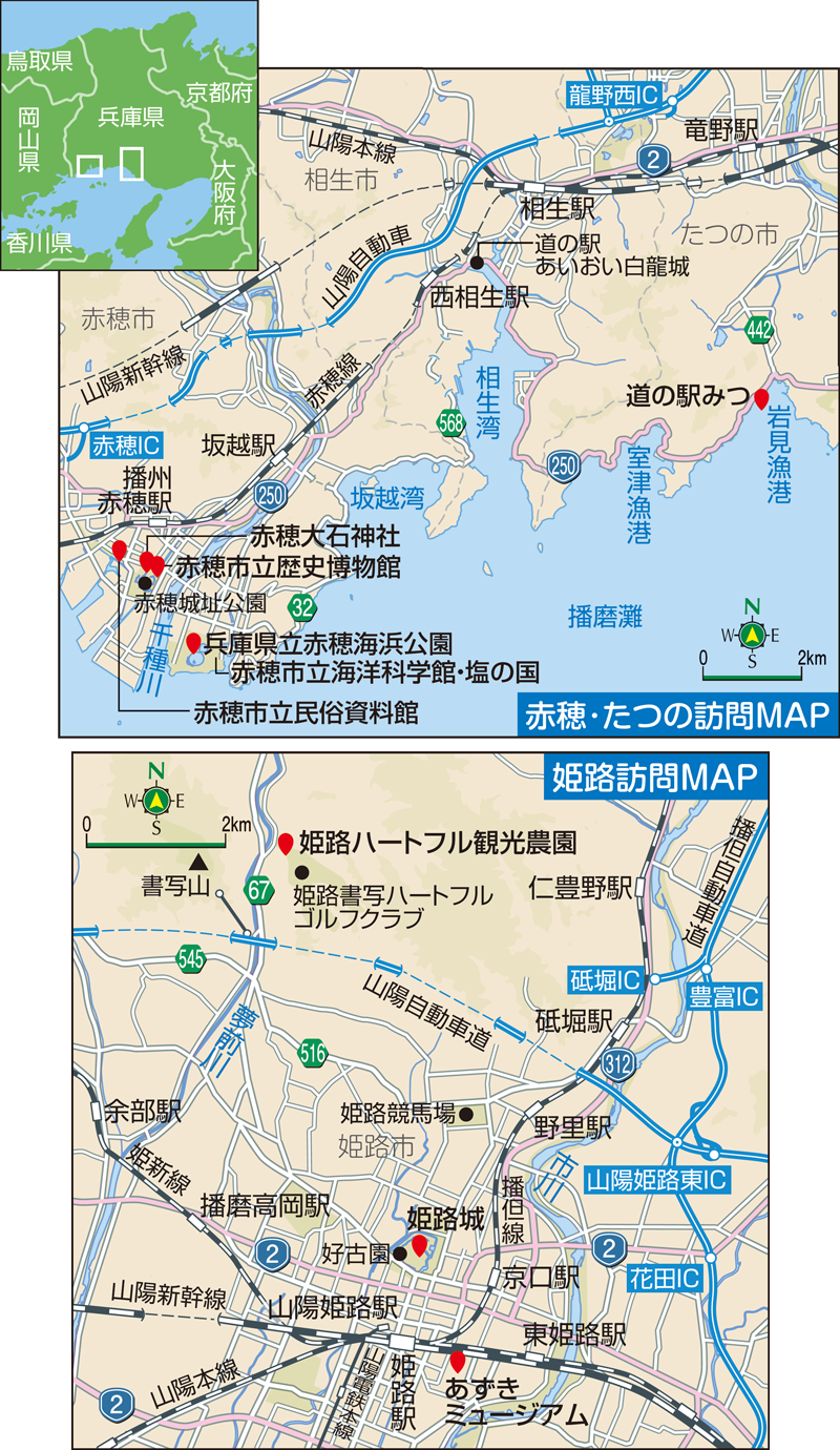 赤穂義士と塩で知られる赤穂(あこう)、海山の幸が豊かなたつの、そして国宝・姫路城のある姫路を訪れました。