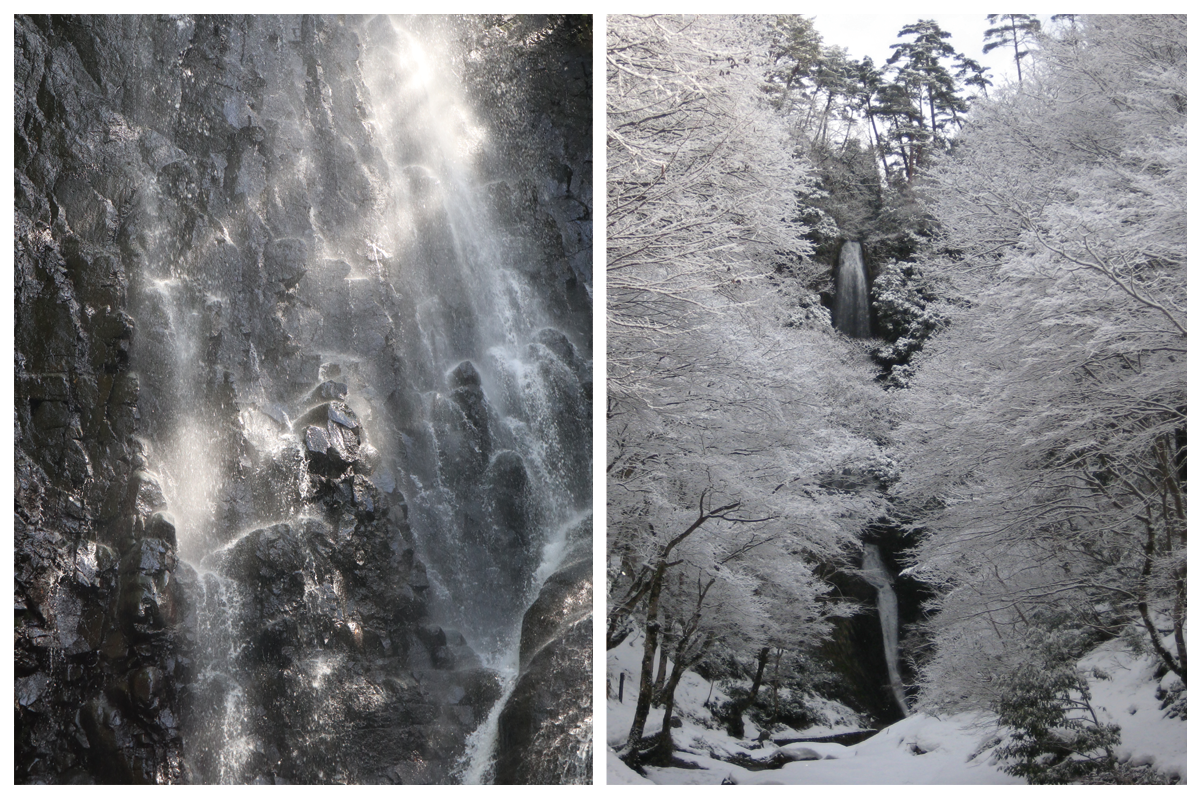 右/名前の由来は、滝が中央で折れる様子が猿の尾に似ていることから。冬は積雪で滝壺に近づけないため、石仏を見るなら他の季節に。