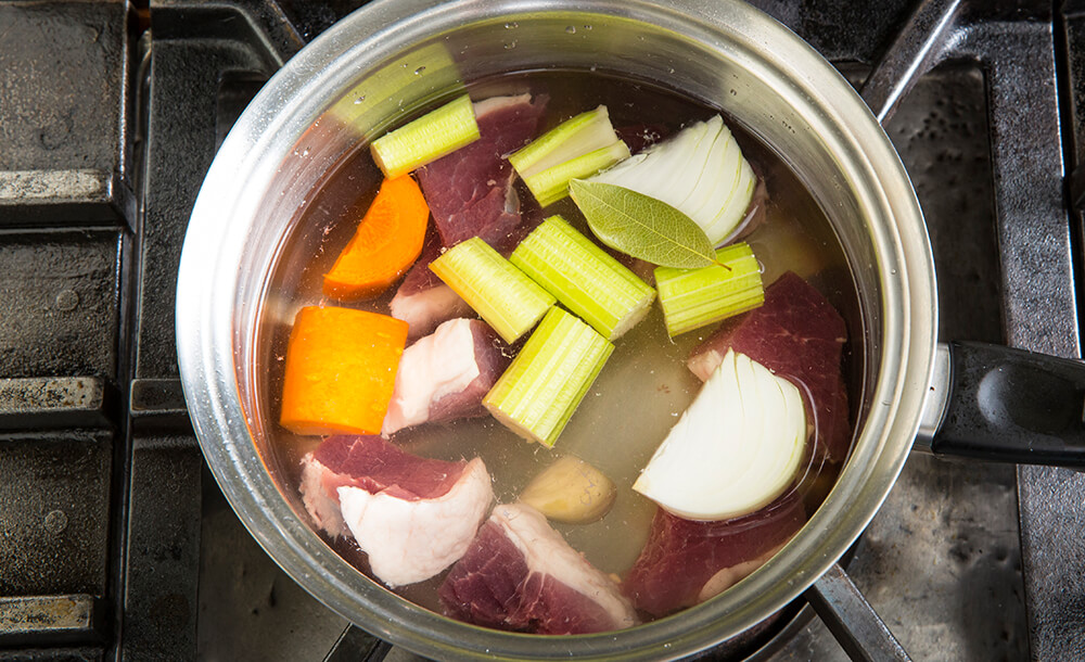 STEP1の材料とローリエを鍋に入れ、ひたひたになるまで水を注ぐ。強火にかけ、アクを適宜取り除きながら沸騰するまで加熱する。沸騰したら火を弱め、塩をひとつまみ加えて蓋をし、コトコトと沸く火加減で約1時間煮込む。10分おきに鍋の中を確認し、アクを適宜取り除き、肉が液体から出ている場合はかぶるように適宜お湯を加える。 猪肉に竹串がスッと刺さる程度まで柔らかくなったら、塩、こしょうで調味する。ザルなどで煮汁を漉し、煮込み用の野菜は取り除く。
