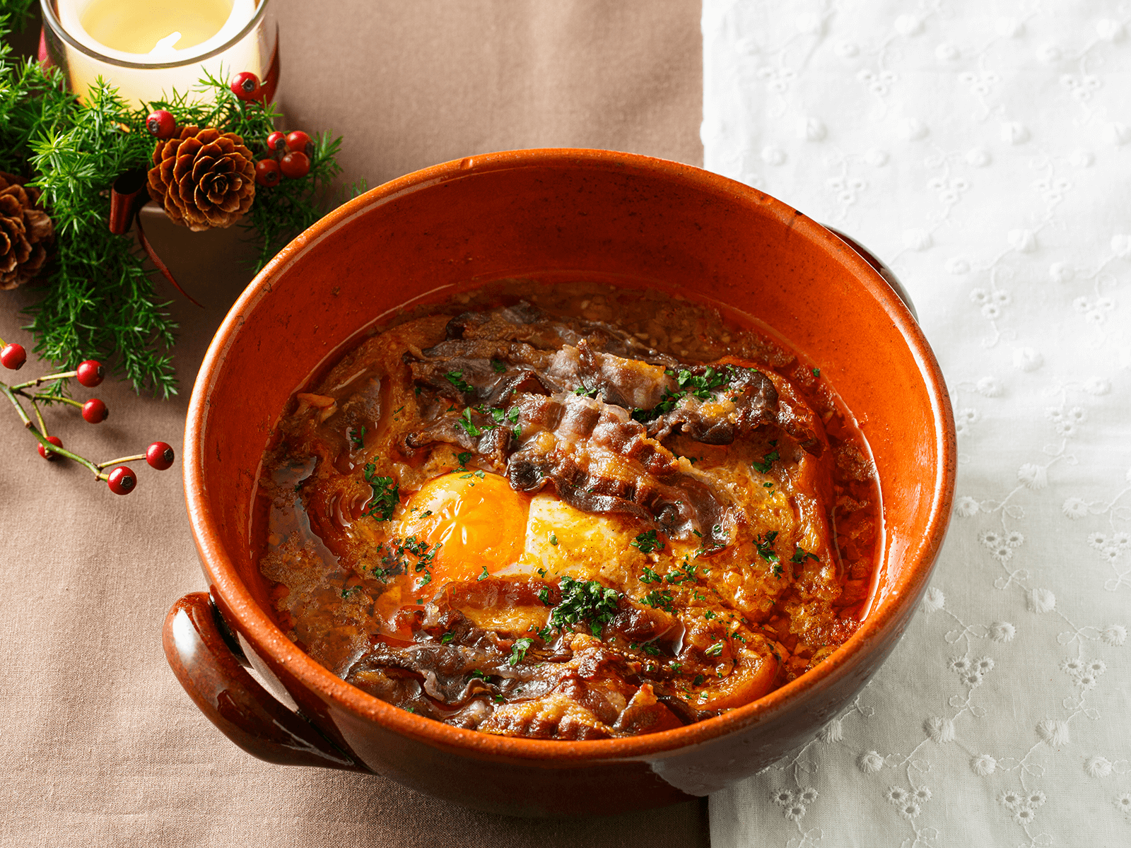 塩をしっかりと振ったスライス肉は、ベーコンのように香ばしく、カリカリの食感です。スープに加えてふわふわになったパンやまろやかな卵と一緒に食べると、クセになるおいしさ。また、ガツンと効いたにんにくと、発汗作用のあるパプリカパウダーで、体が芯から温まります。味にとがりのないスープなので、スープに入れるのは食パンや甘いパンではなく、バゲット等の塩気のあるパンのほうがよく合います。カリカリになるまでしっかりトーストするのがポイント!