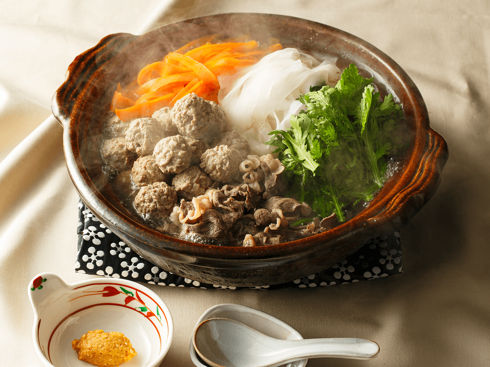 昆布だしが効いた煮汁は、猪肉の味を引き出し、野菜にもうまみがたっぷり染みこみます。猪つくねは、ミンチ肉を使わずブロック肉を切ることで、弾力が残るので、ひと手間ですがお試しください。さらにレンコンのシャキシャキとした歯ごたえで、食感に変化が出ます。猪モモ肉スライスは、適度な歯ごたえがあり、噛めば噛むほどお肉のうまみを感じられます。特製味噌ダレの味噌は、お好みの味噌を。白菜やほうれん草、きのこなどお好きな野菜を入れてもよいでしょう。締めにごはんやうどん、餅などを入れて、最後の一滴まで味わってください。