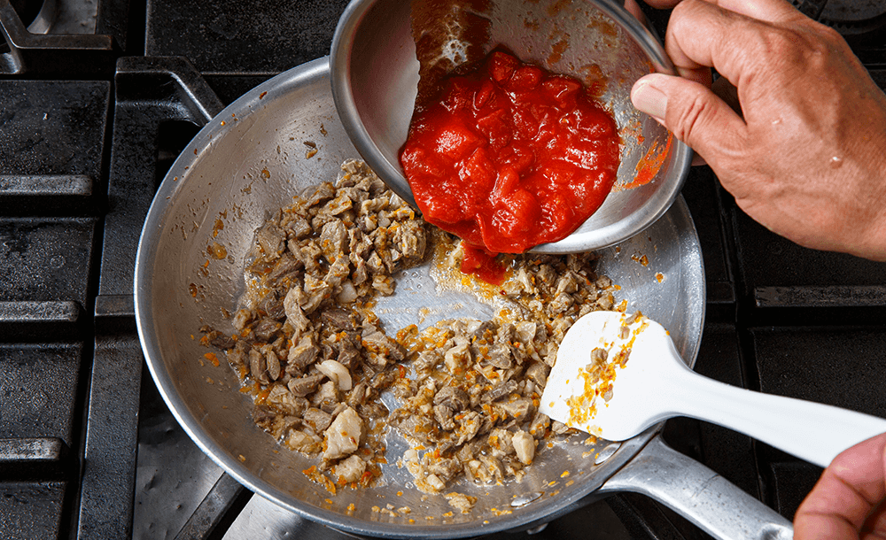 味見をし、必要に応じて塩、こしょうをひとつまみ加えて、弱火でコトコトと5分ほど煮込む。焦げないようにときどきかき混ぜる。肉が液体から顔を出すくらいまで煮込んで味を凝縮させる。