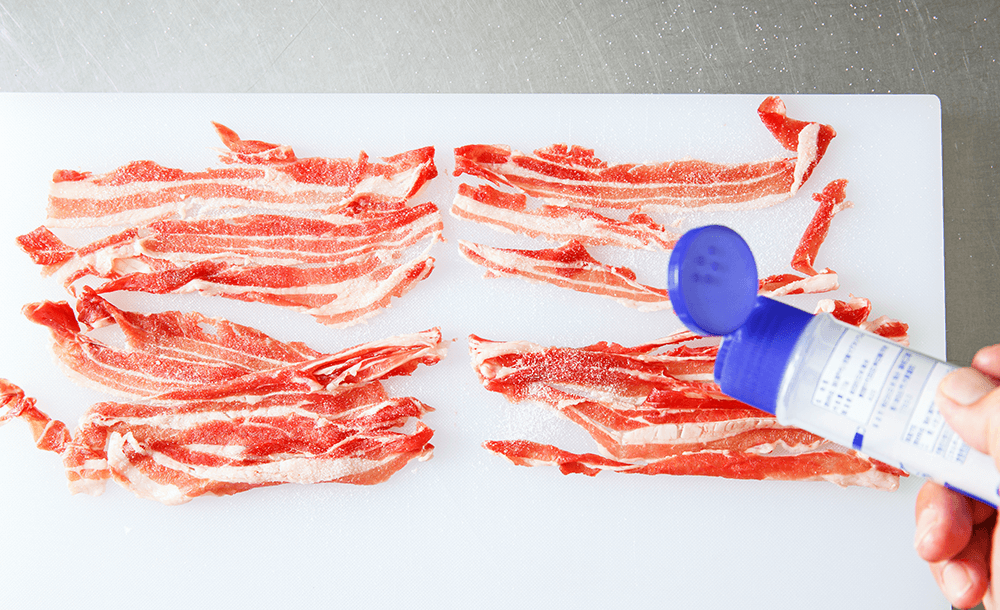 猪バラ肉スライスを半分に切り、片面にのみ塩を多めに振る。ラップをふんわりとかけて、冷蔵庫に30分間入れる。