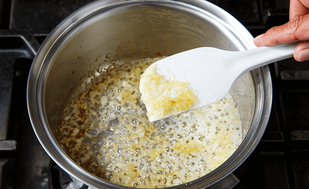 にんにくがうっすらとキツネ色になったら火を止める。玉ねぎのみじん切りを加えて、しんなりするまで弱火でじっくりと炒める。にんにくと玉ねぎは焦がさないように注意しながらゆっくりと炒め、香りと甘みを十分に引き出す。