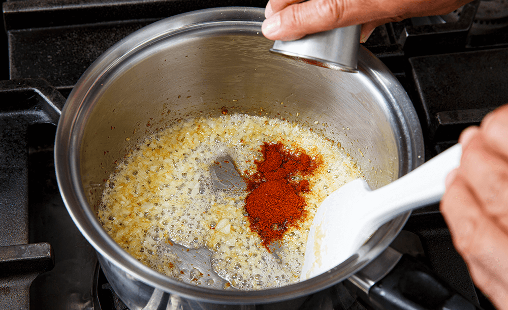 火を止めてパプリカパウダーを加え、余熱でさっと炒めて香りを出す。