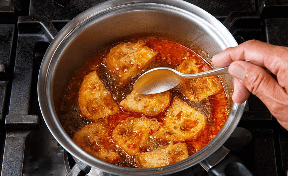 パンを加えて、さらに5分ほど煮る。途中でパンをひっくり返したり、上からスープをかける。