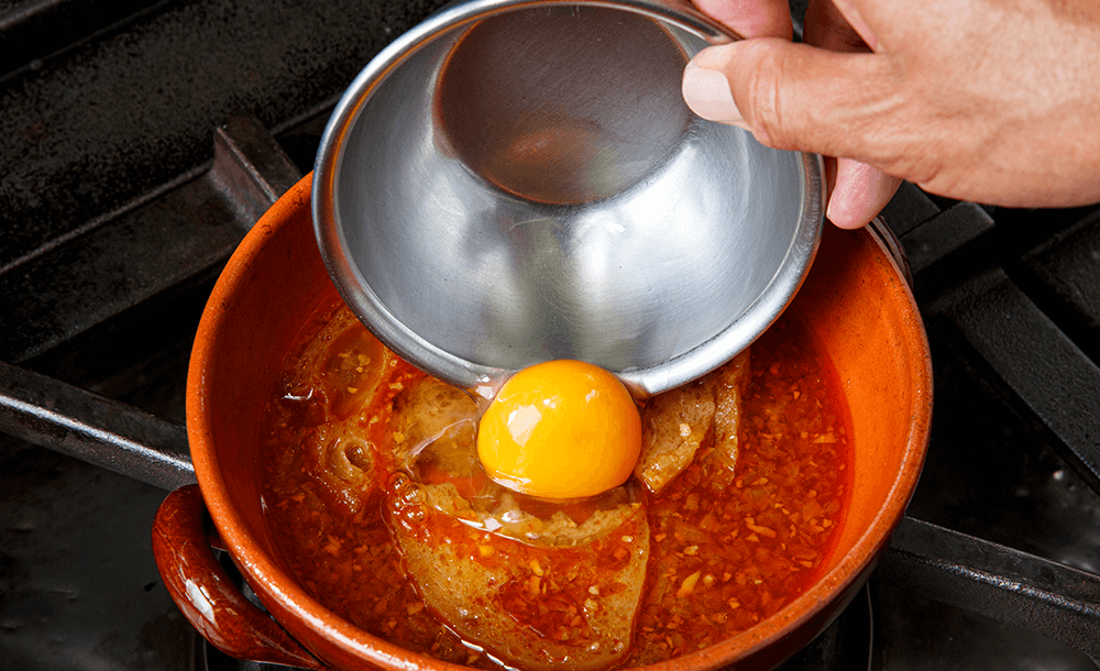 耐熱のスープ皿にSTEP3と全卵を入れ、250℃のオーブンで5分ほど加熱する(オーブンがない場合は、鍋に卵を落とす)。