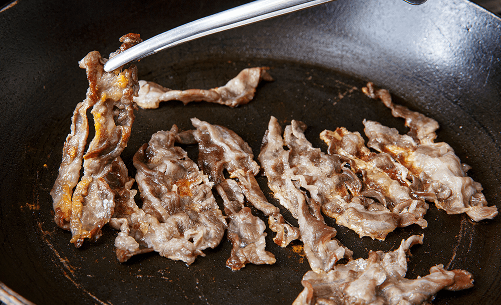 猪バラ肉スライスの表面の水分を拭き取り、フライパンでキツネ色になるまで焼く。このとき、焦がさないように気をつける。