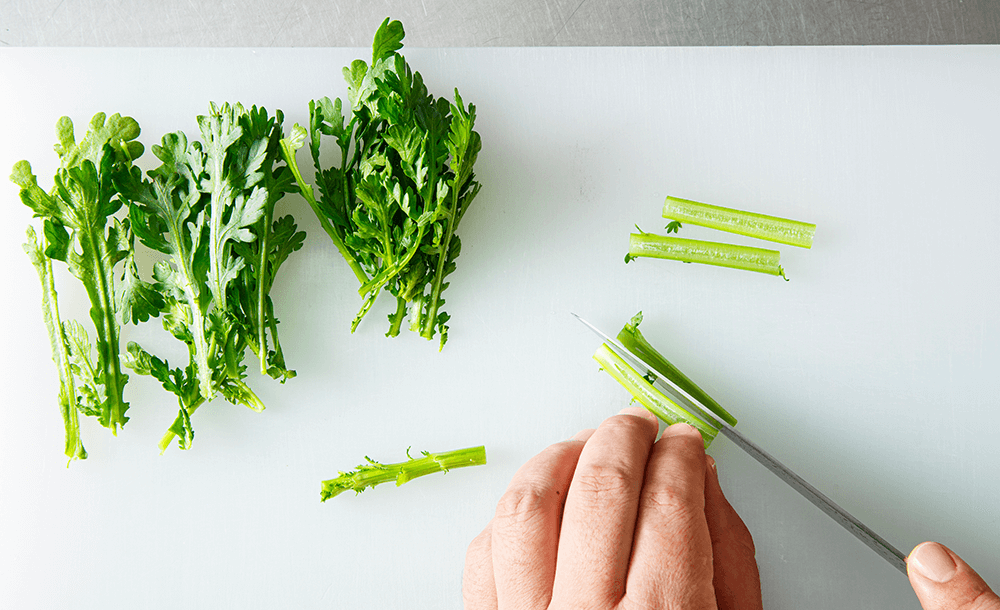 春菊は葉と茎に分けて、茎の太い部分は縦半分に切る。それぞれ5cmくらいの長さにする。