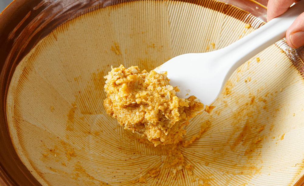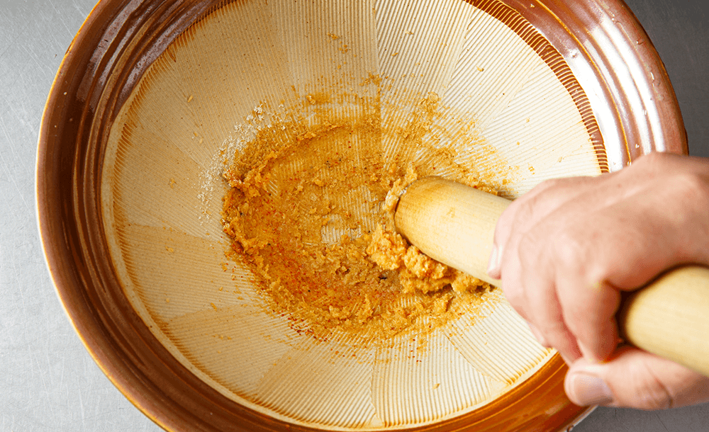 味噌、砂糖、七味唐辛子を加えて、さらにすり混ぜる。