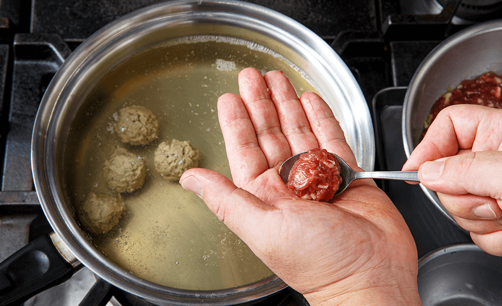 沸騰直前の昆布だしに、つくね生地を濡らしたスプーンで丸めて入れる。