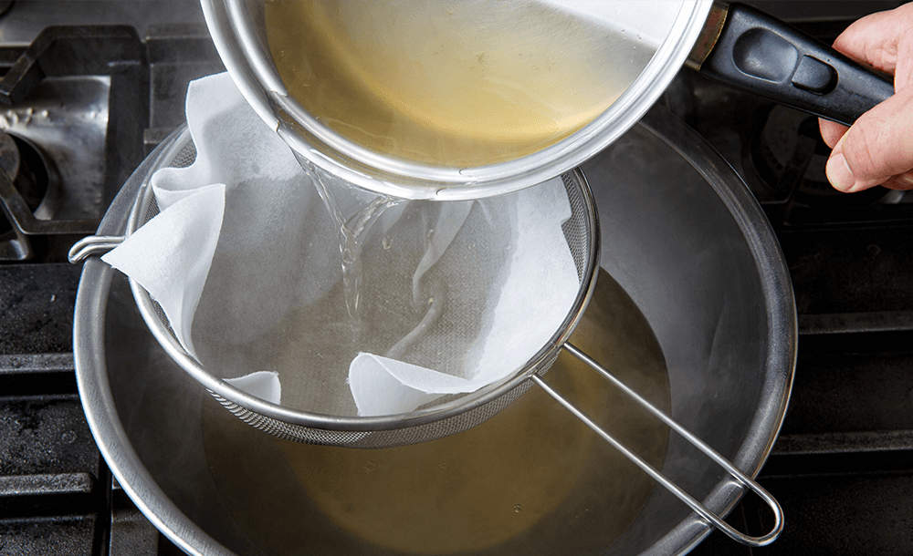 つくねに火が通ったら取り出し、ゆで汁を漉す。