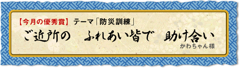 佳作の1番(訓練が 地域を守り 身を守る)の句も、まさにこの通りですね。地域に訓練を積んだ人が多ければ多いほど、地域の防災力はアップします。防災訓練では、2番(訓練は やったもん勝ち つく自信)のように、消火器や救助に役立つ道具(のこぎりやバールなど)の使い方、応急手当の仕方などを、率先して実際に体を使って覚えることが大切です。これが自信となり、3番(きびきびと 動ける自分が そこにいる)のように、”いざ“という時に冷静に動けるようになるのです。