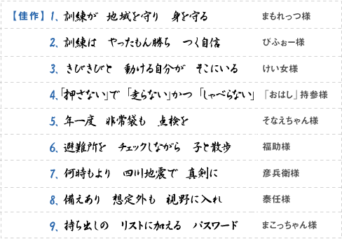 そして7番(何時もより 四川地震で 真剣に)の句。いまは海外で起こったことでもリアルな映像が次々に入ってくる時代です。被災地の状況から災害の恐ろしさや現実を学び、一人ひとりが真剣に「防災」に取り組んでいただけたらと思います。