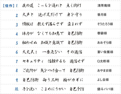 8番(ご近所が 気をつけ合って 自己防衛)と9番(自己防衛 向う三軒 輪がカギに)で詠まれている「ご近所パワー」。お隣同士で協力することが、自己防衛に繋がることを認識していただきたい。「不審者がいたそうですよ」「明日から外出します」、こんな会話が防犯意識を高めることになるのですぞ。